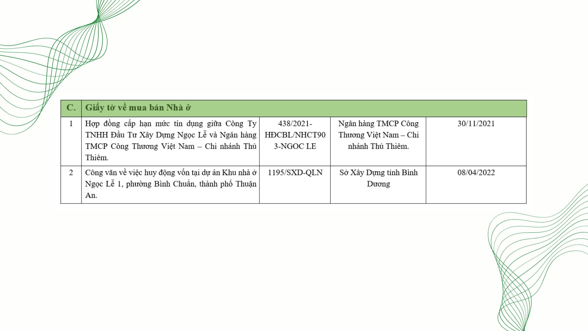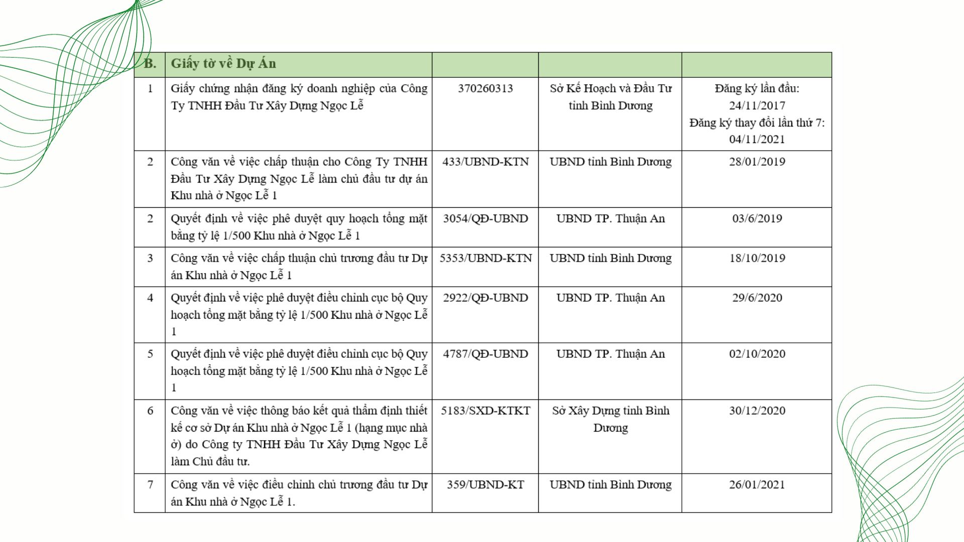 1. Tên chủ đầu tư: CÔNG TY TNHH ĐẦU TƯ XÂY DỰNG NGỌC LỄ – Giấy chứng nhận đăng ký doanh nghiệp số: 3702620313 đăng ký lần đầu ngày 24/11/2017 và đăng ký thay đổi lần thứ 7 ngày 04/11/2021, nơi cấp: Phòng đăng ký kinh doanh Sở Kế Hoạch và Đầu Tư tỉnh Bình